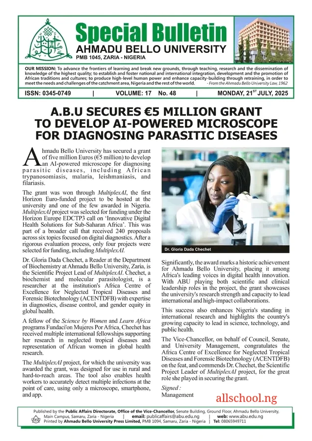 Ahmadu Bello University has secured a grant of five million Euros (€5 million) to develop an AI-powered microscope for diagnosing parasitic diseases, including African onchocerciasis, malaria, leishmaniasis, and schistosomiasis.