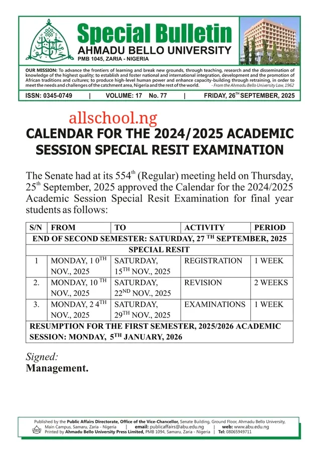 ABU Zaria Special Resit Examination Calendar For The 2024/2025 Academic Session is Out.