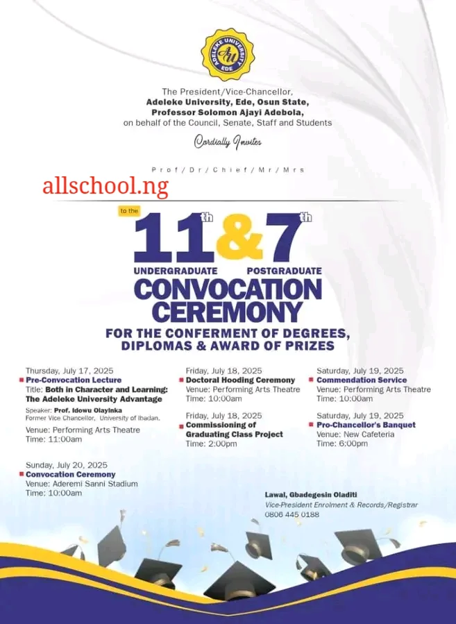 The management of Adeleke University ede cordially invites the general public to her 11th Undergraduate and 7th Postgraduate convocation ceremony scheduled to hold as follows