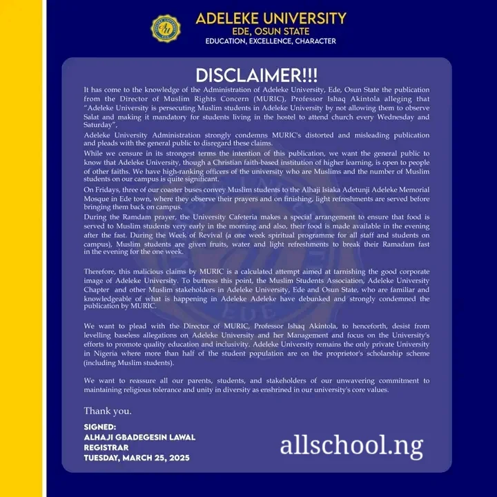 It has come to the knowledge of the Administration of Adeleke University, Ede, Osun State the publication from the Director of Muslim Rights Concern (MURIC), Professor Ishaq Akintola alleging that “Adeleke University is persecuting Muslim Students in Adeleke University by not allowing them to observe Salat and making it mandatory for students living in the hostel to attend church every Wednesday and Saturday”.