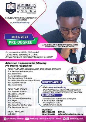Application is hereby invited into various Pre -degree programmes of Admiralty University of Nigeria (ADUN), Delta State, for 2022/2023 Academic Session.