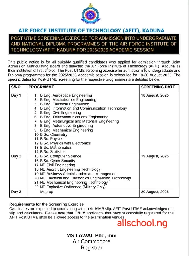 AFIT Post UTME Dates for all Courses