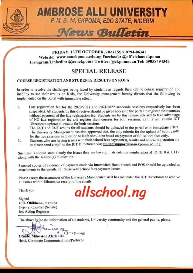 Ambrose Alli University, Ekpoma, Edo State (AAU) important notice on course registration and students results on Kofa
