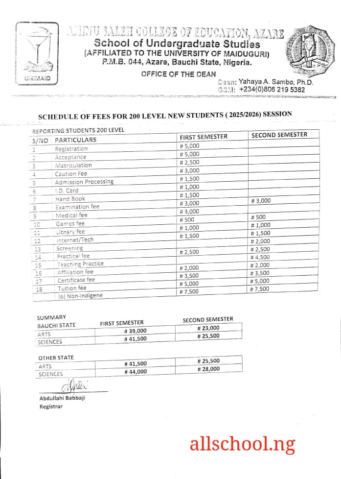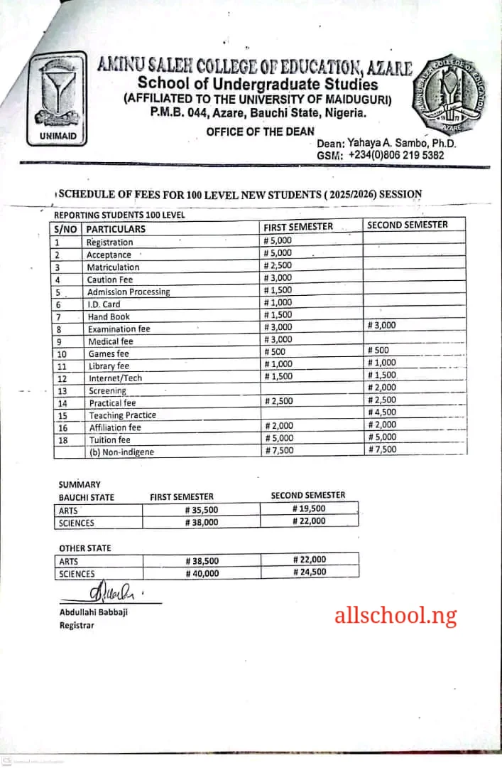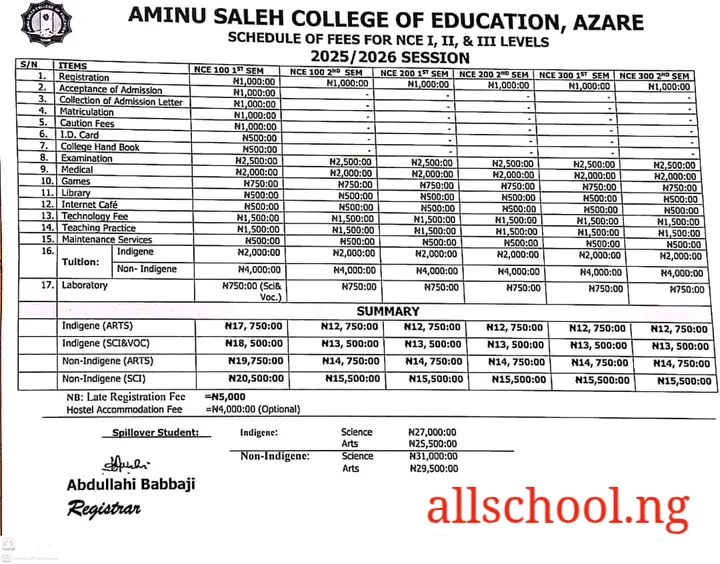 The management of the Aminu Saleh College of Education, Azare (ASCOEA) has published the school fees schedule for the 2025/2026 academic session.