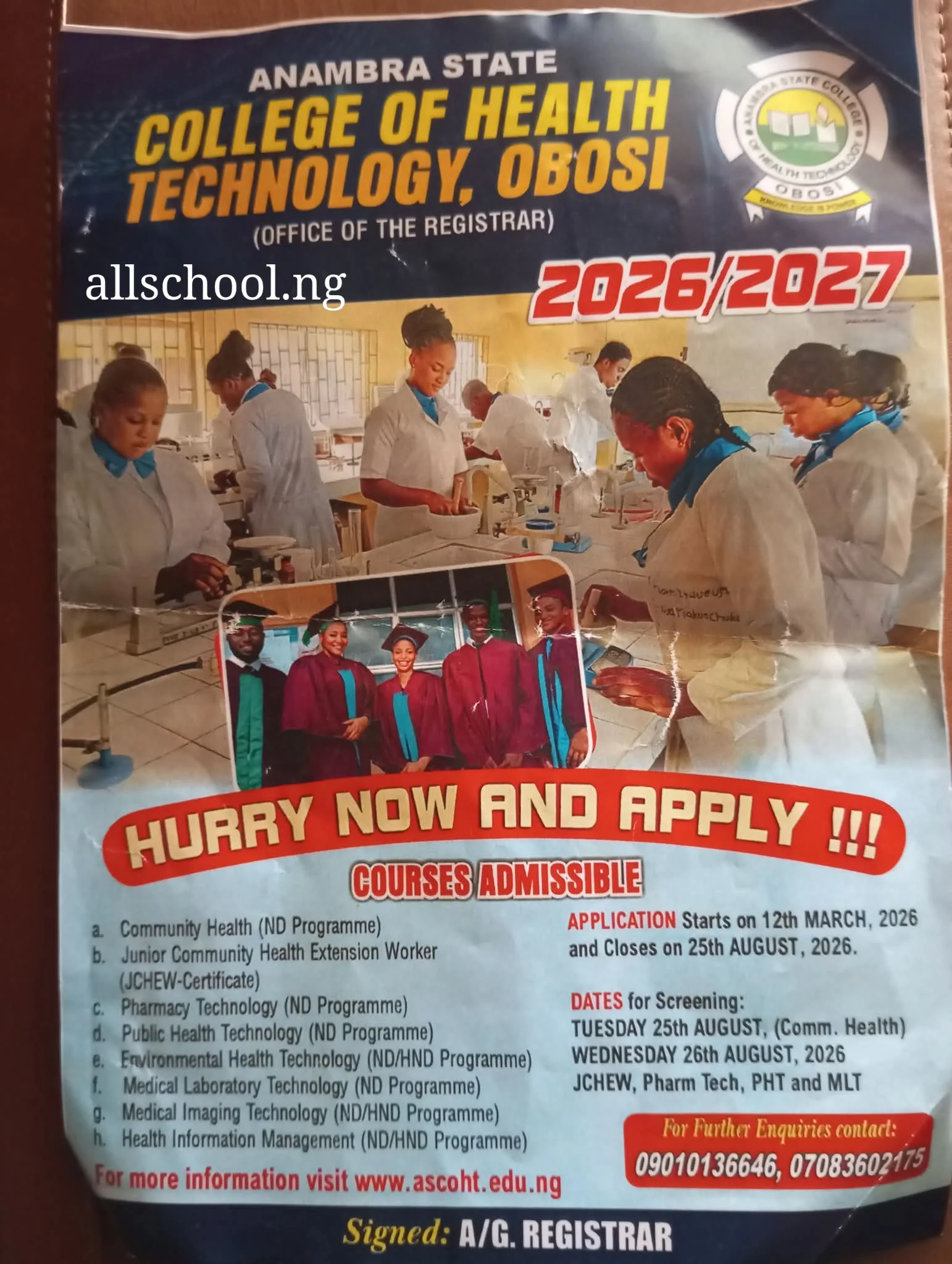 Anambra State College Of Health Technology (ASCOHT), Obosi Admission Form for 2026/2027 Session is now on sale. Registration Closes On 25th August, 2026.