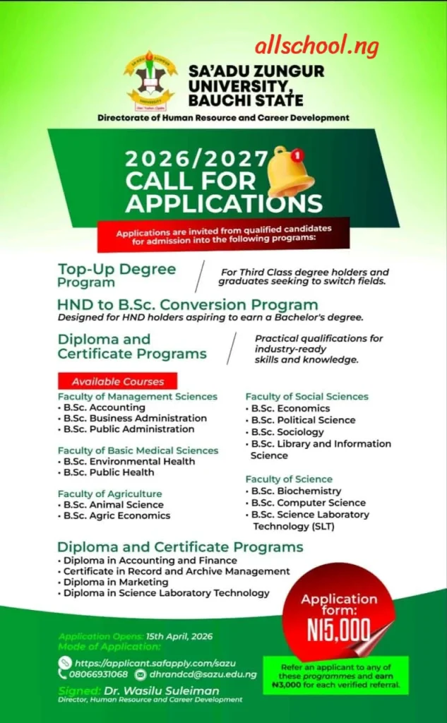Applications are hereby invited from suitably qualified candidates for admission into the following Programmes of the Sa’adu Zungur University, Bauchi State for the 2026/2027 Academic Session: