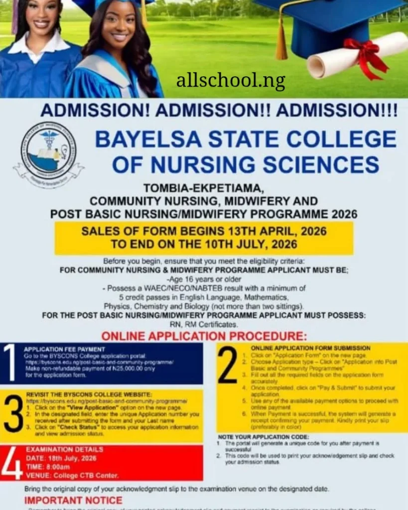 The management of Bayelsa State College of Nursing Sciences (BYSCONS) is pleased to announce that the sale of application forms for the 2026 academic session has officially begun. This admission cycle includes various professional programs aimed at training the next generation of healthcare providers in the region.