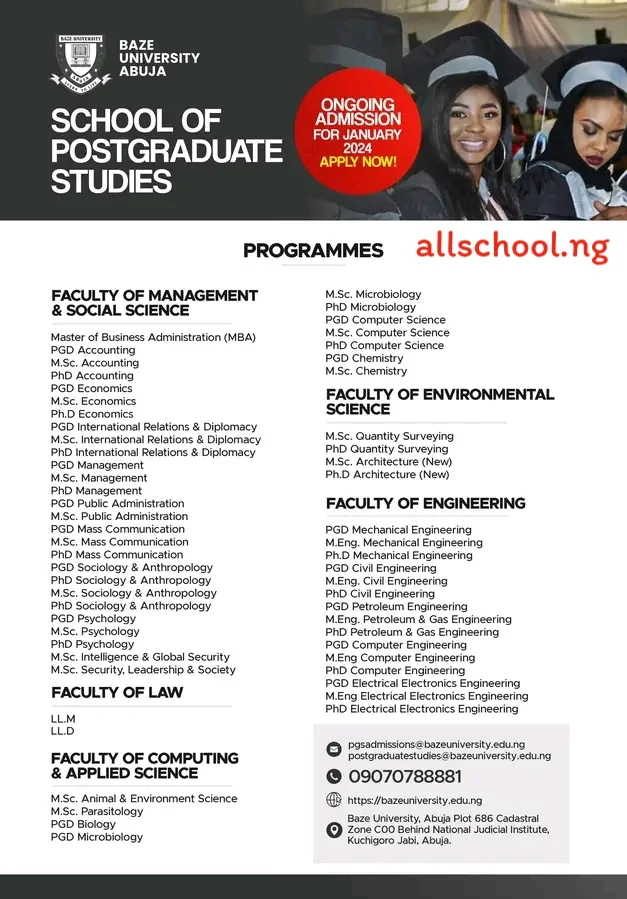 postgraduatestudies@bazeuniversity.edu.ng, 09070788881.