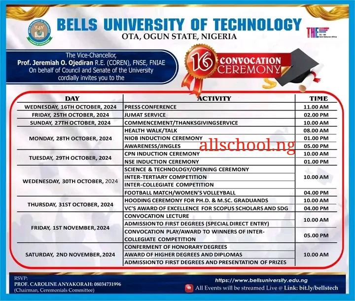 Bells University of Technology Programme of Events for the 16th Convocation Ceremony has been released