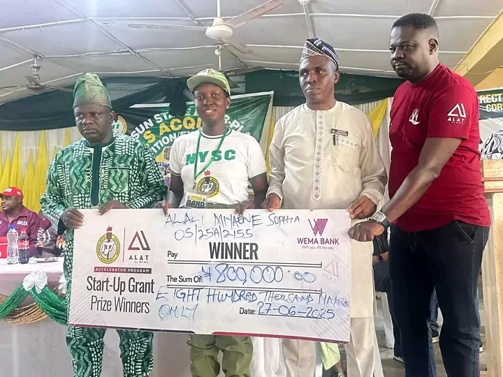 Following a careful evaluation by a panel of judges comprising a team from Wema Bank led by Mr. Babatunde Oshodi as Chief Judge, alongside two NYSC staff members, Mr. Fagbemi Gbenga and Mrs. Olowo Abosede, four outstanding entrepreneurs emerged as winners. Alali Miyaene Sophia clinched the top prize of ₦800,000. Adeyonu Demilade (OS/25A/2925) secured second place with ₦700,000, while Adeleke Mosinmiloluwa Mary (OS/25A/2684) was awarded ₦600,000 for third place. Kuti Oluwafunmilayo (LA/25A/13030) earned ₦200,000, finishing in fourth place. The grants reflect Wema Bank’s strong commitment to promoting youth-led innovation and entrepreneurship across Nigeria.