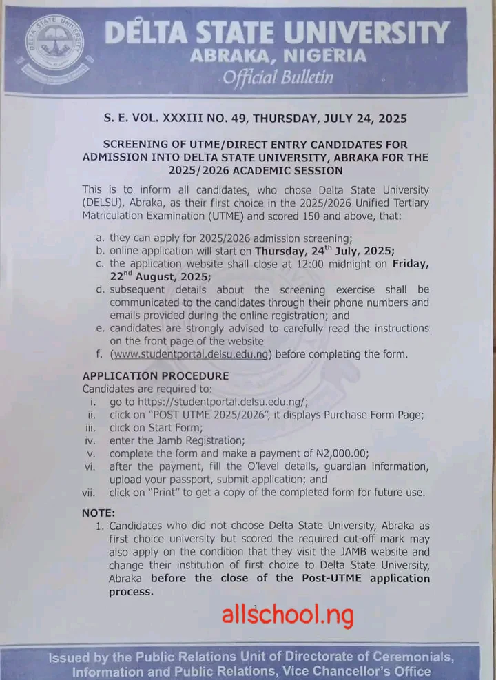 This is to inform all candidates who chose Delta State University (DELSU), Abraka, as their first choice in the 2025/2026 Unified Tertiary Matriculation Examination (UTME) and scored 150 and above, that: