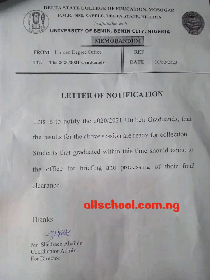 This is to notify the 2020/2021 UNIBEN graduands, that the results for the above session are ready for collection. Students that graduated within this time should come to the office for briefing and processing of their final clearance.