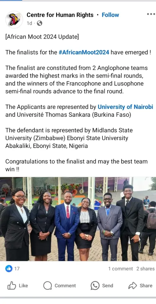 The competition brings together the brightest legal minds from across Africa, and EBSU’s presence in the finals underscores its growing reputation in legal scholarship and advocacy.