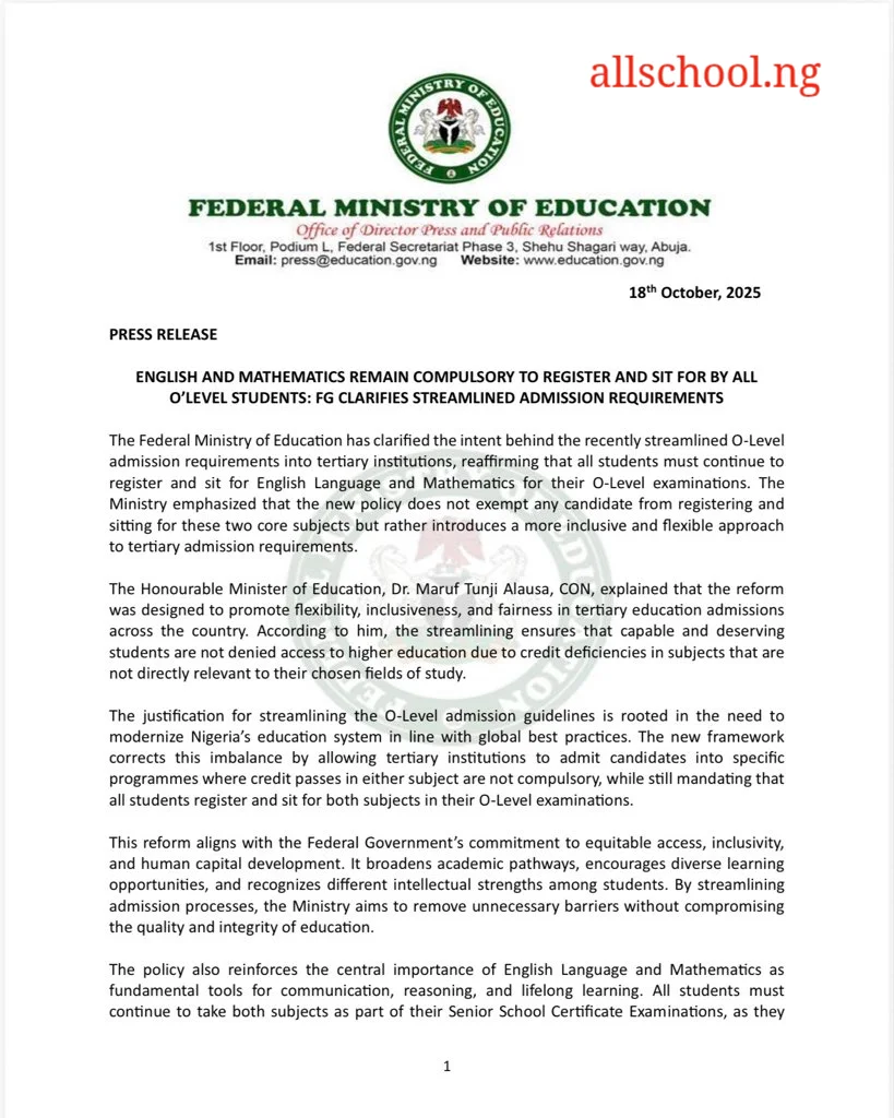 The Federal Ministry of Education has clarified the intent behind the recently streamlined O-Level admission requirements into tertiary institutions, reaffirming that all students must continue to register and sit for English Language and Mathematics for their O-Level examinations. The Ministry emphasized that the new policy does not exempt any candidate from registering and sitting for these two core subjects but rather introduces a more inclusive and flexible approach to tertiary admission requirements.