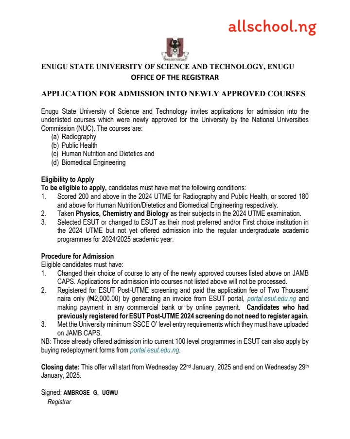 Enugu State University of Science and Technology, ESUT Admission Into Newly Approved Courses 2024/2025 is Out. The form cost N2000. The closing date is Wednesday, January 29, 2025..