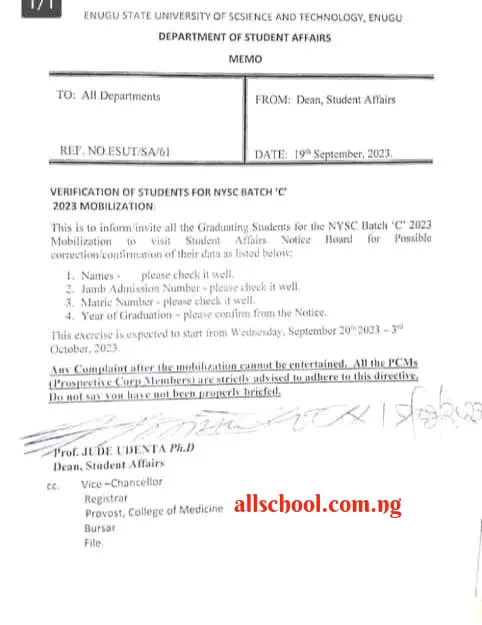 Enugu State University Of Science And Technology, ESUT notice on verification of students for NYSC Batch C 2023 mobilization.