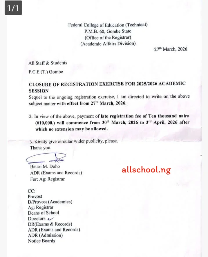 Federal College Of Education (Technical) Gombe students registration deadline.