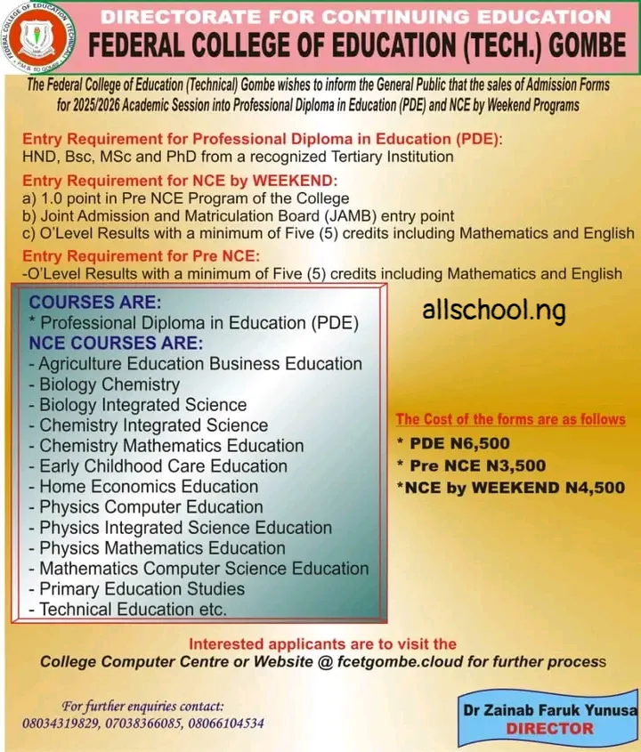 The Federal College of Education Technical Gombe wishes to announce to the general public that the sale of forms for the 2025/2026 Academic Session is ongoing and any interested. applicant should visit the College Computer center to pay for the forms. Prospective candidates are to come along with a copy of all educational documents for the application process.