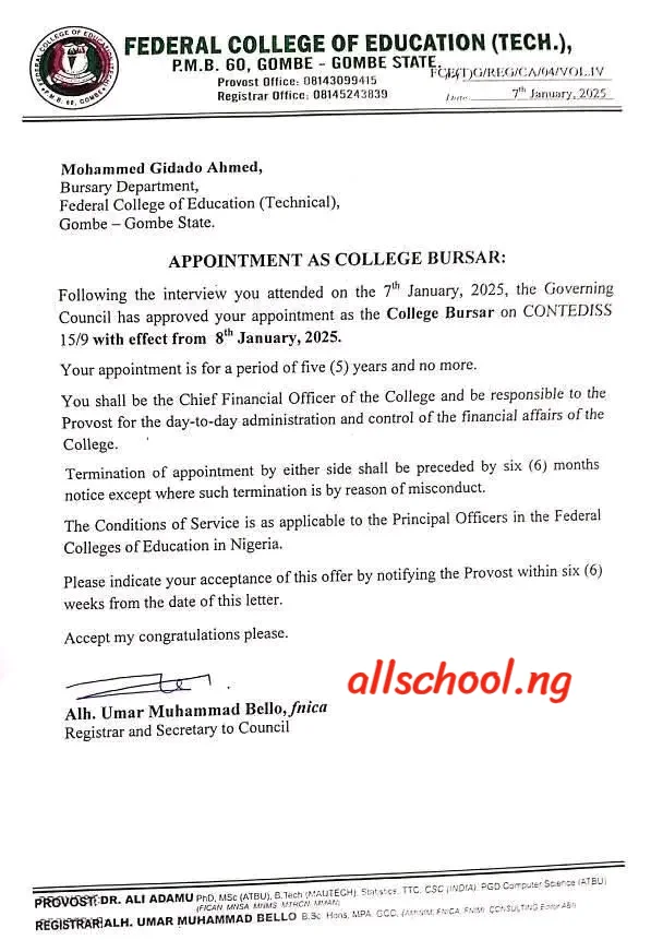 The 8th Governing Council of the Federal College of Education Technical Gombe, has approved the appointment of Mohammed Gidado Ahmed as the Substantive Bursar of the Institution.