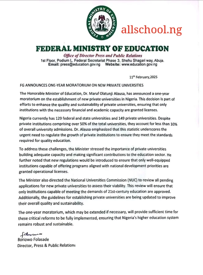 The Honorable Minister of Education, Dr. Maruf Olatunji Alausa, has announced a one-year moratorium on the establishment of new private universities in Nigeria.