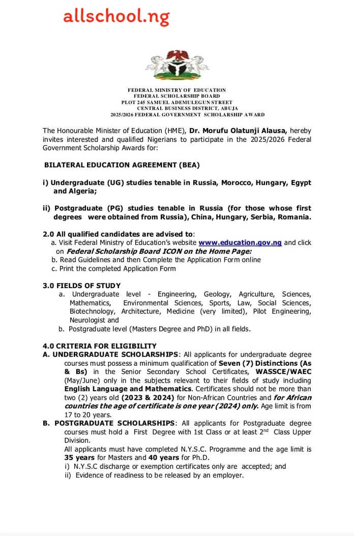 The Honourable Minister of Education (HME), Prof. Tahir Mamman OON, SAN, hereby invites interested and qualified Nigerians to participate in the 2026/2025 Federal Government Scholarship Awards for: