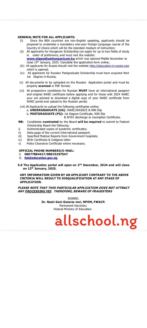 OFFICIAL PHONE NUMBERS/E-MAIL: 08077884417, fsb@education.gov.ng.