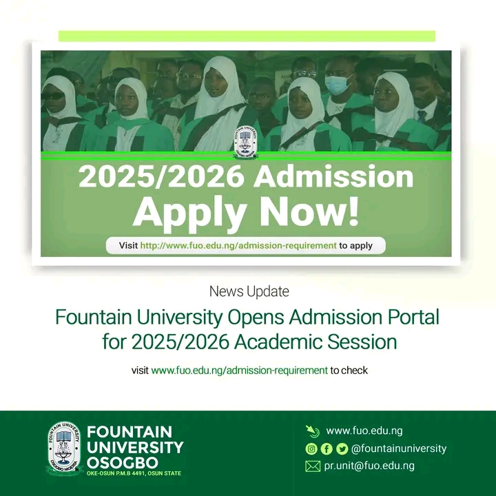 Hence, applications are invited from suitably qualified candidates for the Screening Exercise for admission into the DEGREE Programmes of Fountain University, Osogbo (FUO) for the 2024/2025 Academic Session.