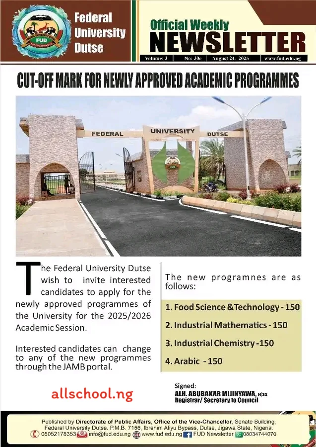 LATEST UPDATE: FUDutse JAMB cut off marks for newly approved academic programmes