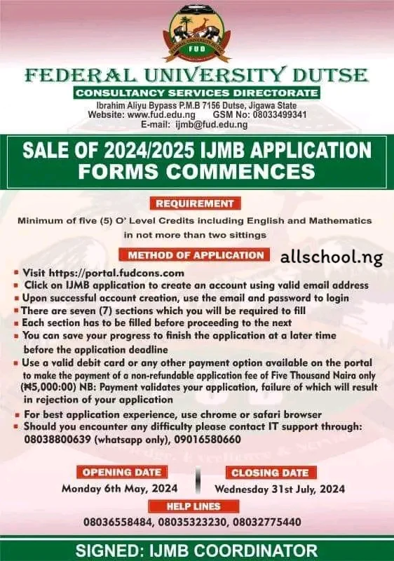 The Federal University Dutse (FUDutse) IJMB Admission Form for the 2023/2024 Academic Session has been released. The Closing Date is on Wednesday, 31st July 2024. The form cost N5,000.