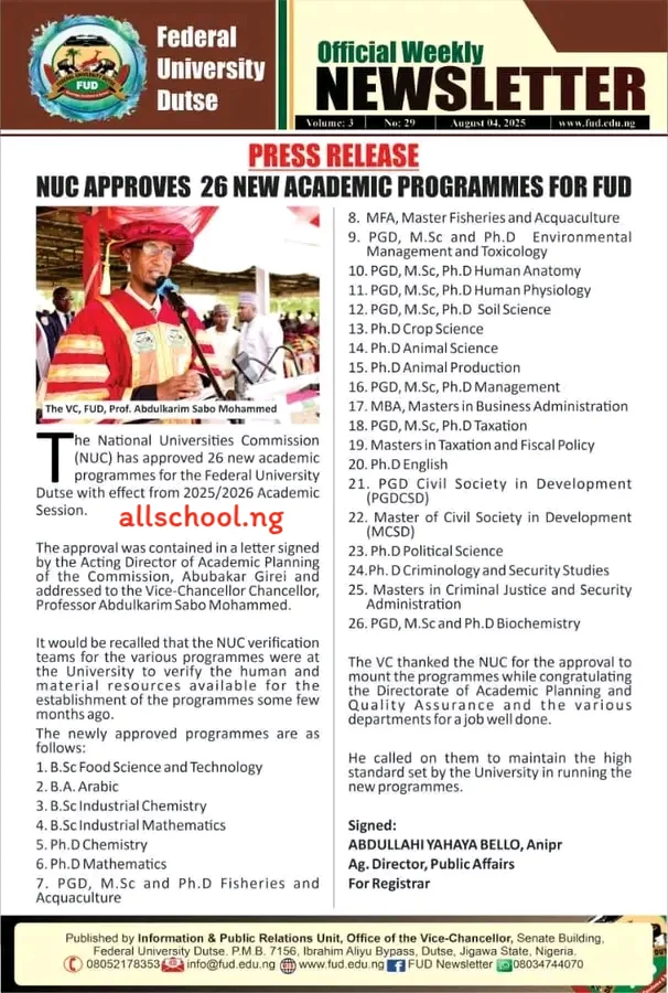 The Federal University Dutse, FUDUTSE has Secured the National Universities Commission, NUC Accreditation for 26 New Academic Programmes .