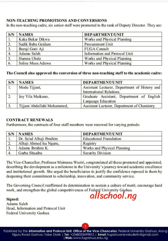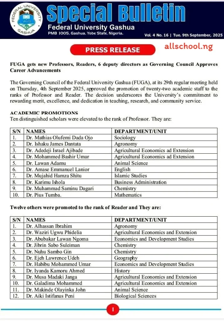 The Governing Council of Federal University Gashua, at its 29th regular meeting held on Thursday 4th September 2025, approved the promotion of twenty-two academic staff to the ranks of Professor and Reader. The decision reflects the University’s commitment to rewarding merit and excellence in teaching, research, and community service.