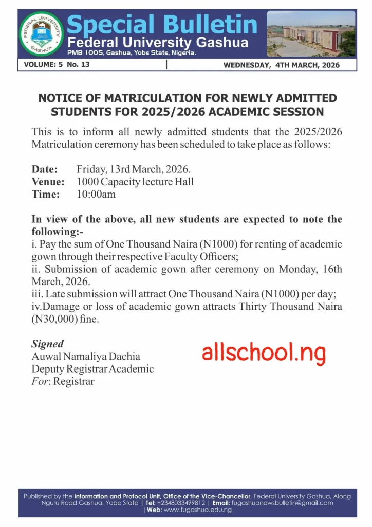This is to inform all newly admitted students that the 2025/2026 Matriculation ceremony has been scheduled as follows: