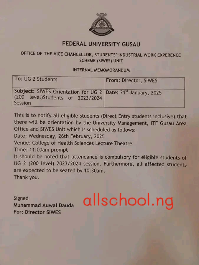 Federal University of Gusau Management has released the scheduled for students industrial training scheme, SIWES orientation program for 2024/2025 academic session.