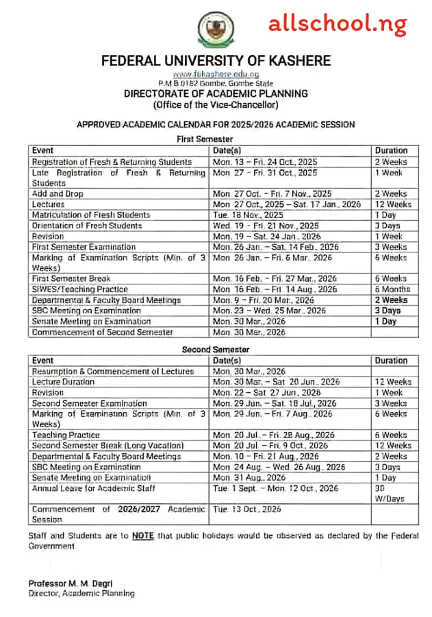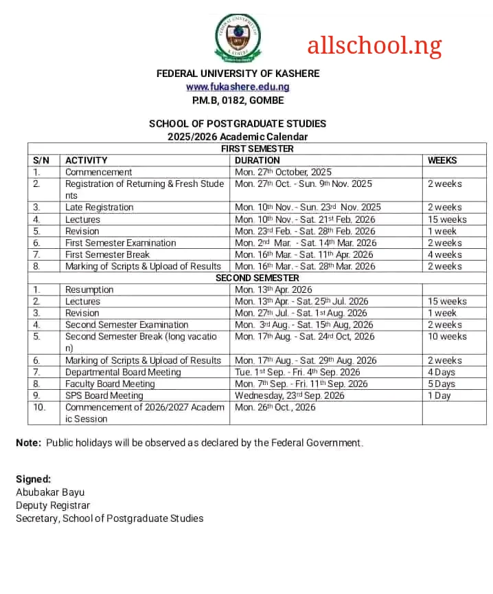 FUKASHERE Academic Calendar: Federal University Kashere (FUKASHERE) Approved Academic Calendar for 2025/2026 Session has been released. The Postgraduate Academic Calendar has been released.