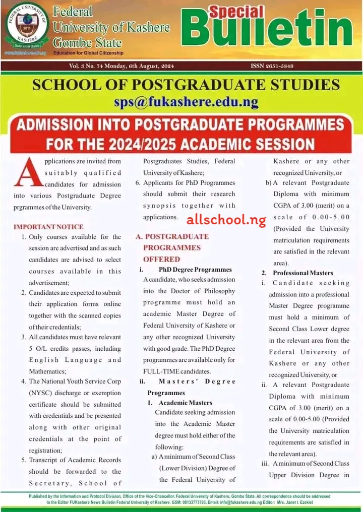 FUKASHERE Postgraduate Form is Out: Federal University Kashere, (FUKASHERE) Postgraduate Admission Form for 2024/2025 Session is now on sale. Form cost N20,000. The Closing Date is on 8th October, 2024 .