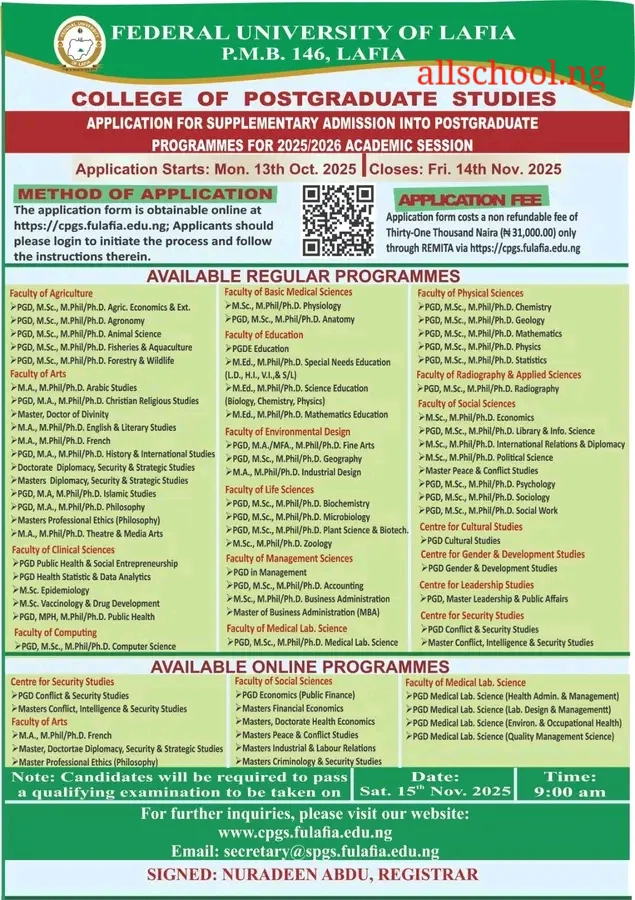 This is to inform interested candidates that the Federal University Lafia (FULafia) has commenced the sale of application forms for admission into the PGD, M.A/M.Sc and M.Phil/Ph.D postgraduate programmes for the 2025/2026 Academic Session.