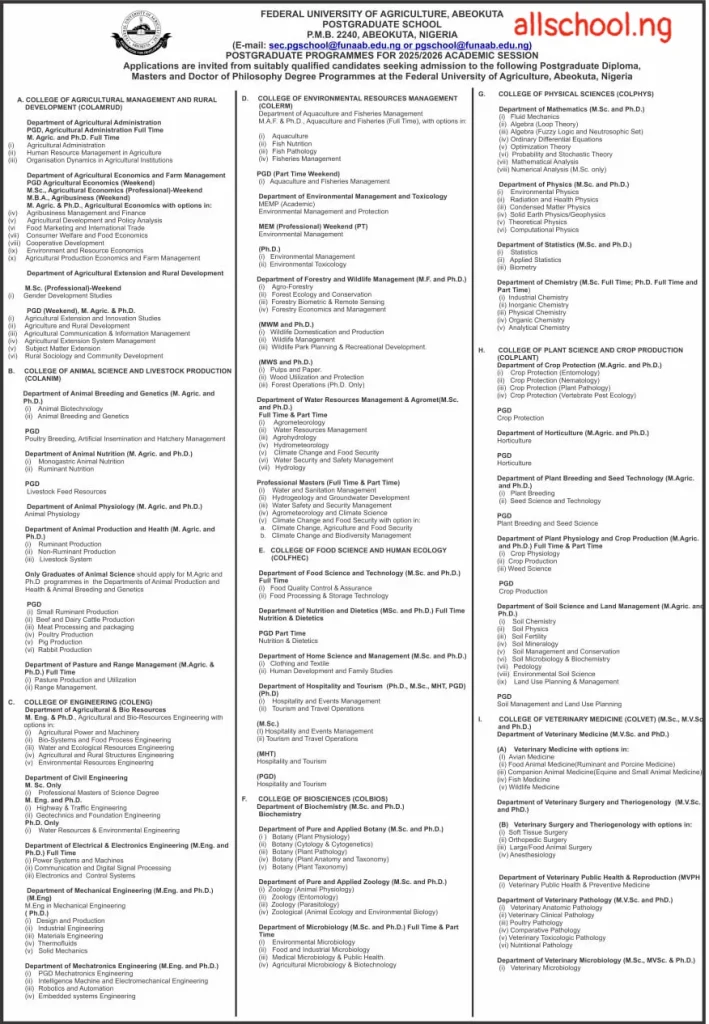 Applications are invited from suitably qualified candidates seeking admission to the following Postgraduate Diploma, Masters and Doctor of Philosophy Degree Programmes at the Federal University of Agriculture, Abeokuta, Nigeria