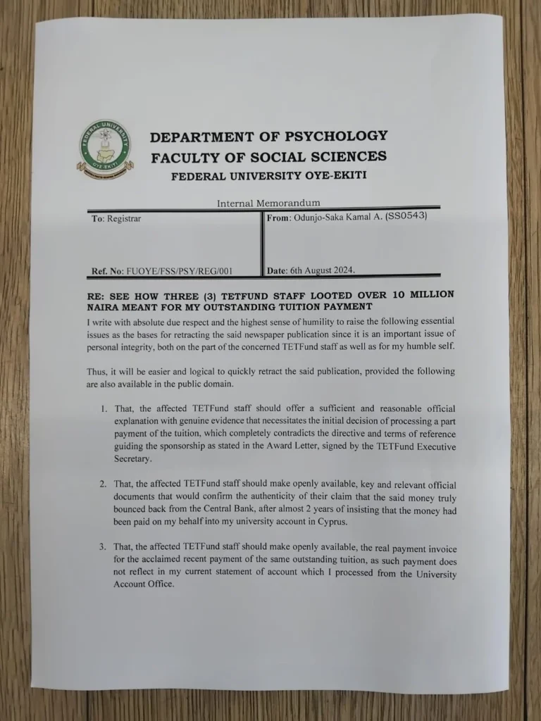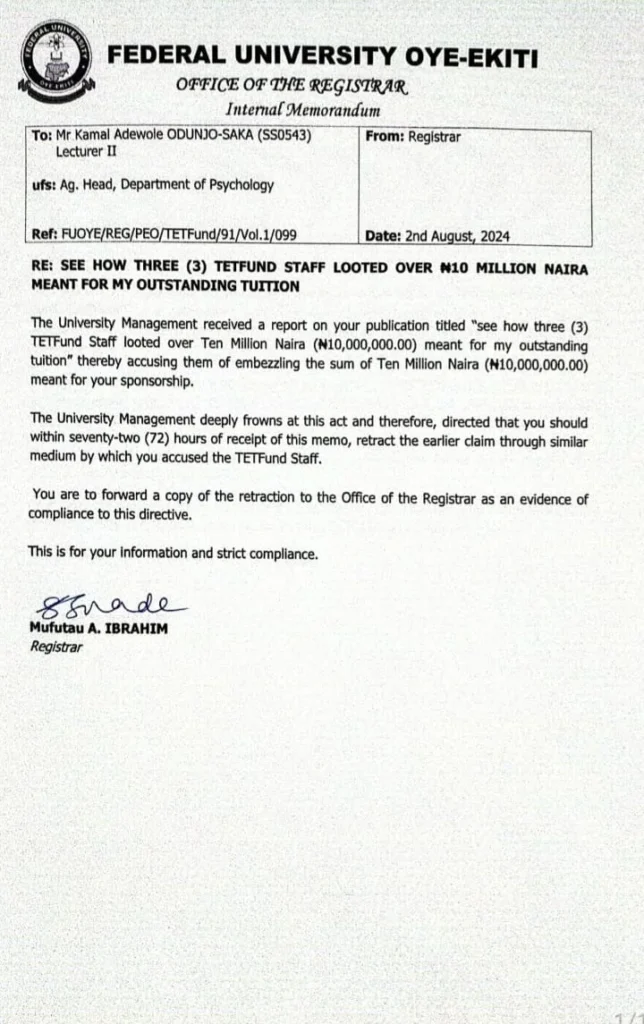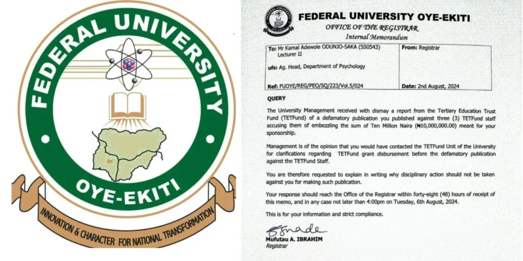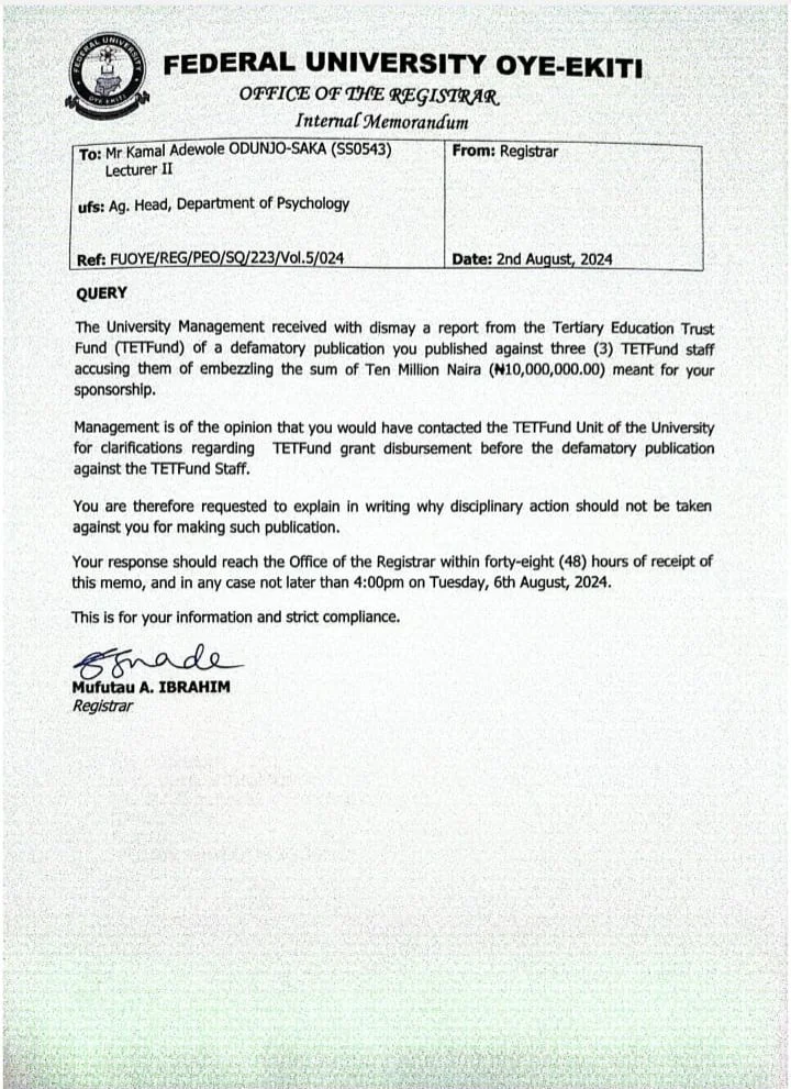 Odunjo-Saka, a lecturer in the Department of Psychology, described his suspension as “baseless and illegal,” alleging that three TETFund staff members mishandled the funds, leading to delays and financial difficulties that disrupted his studies. According to him, repeated efforts to resolve the matter with TETFund and FUOYE management were met with excuses and bureaucratic hurdles, ultimately forcing him to self-fund parts of his education.