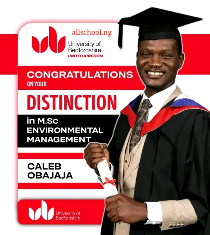 Mr. Caleb Obajaja, a Graduate Assistant in the Department of Environmental Management and Toxicology, Federal University Oye-Ekiti, has successfully completed his Master of Science (MSc) in Environmental Management at the University of Bedfordshire, Luton, United Kingdom.