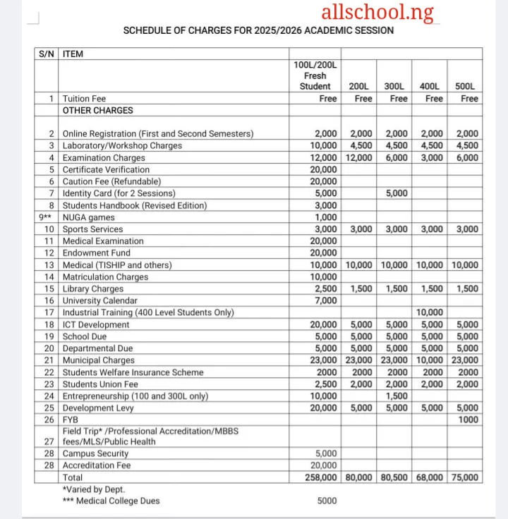 SCHEDULE OF CHARGES FOR 2025/2026 ACADEMIC SESSION