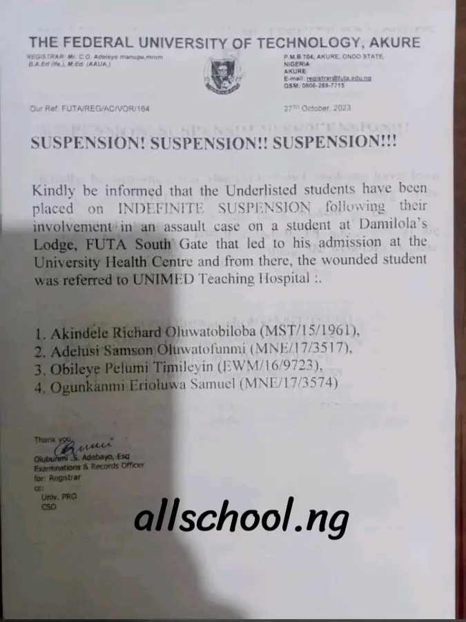 Federal University Of Technology, Akure FUTA suspends 4 students indefinitely over an assault case.