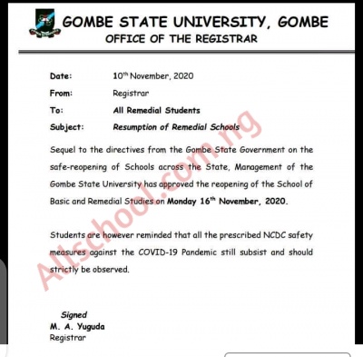 Sequel to the directives from the Gombe State Government on the safe-reopening of schools across the state, Management of the Gombe State University has approved the reopening of the School of Basic and Remedial Studies on Monday, 16th November 2020.