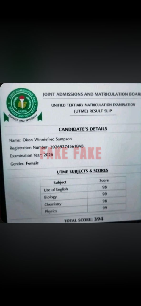 The Joint Admissions and Matriculation Board (JAMB) has warned that a purported result slip currently circulating online, claiming that a candidate scored 396 in the 2026 UTME, is fake.