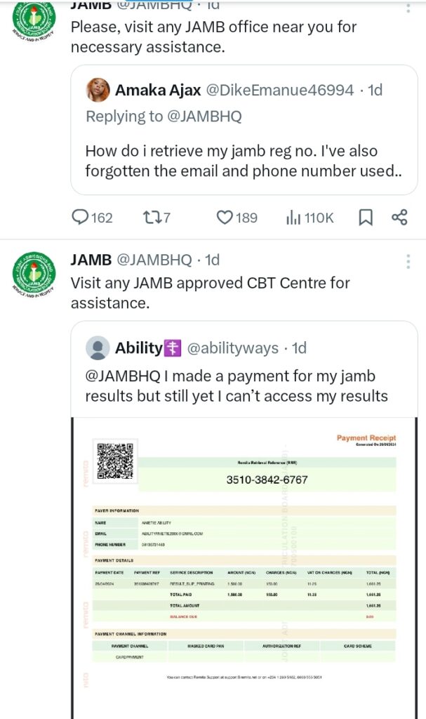 Similarly, another user, @abilityways, raised concerns about payment made for results without successful access. JAMB directed the candidate to seek assistance at any JAMB approved CBT Centre.