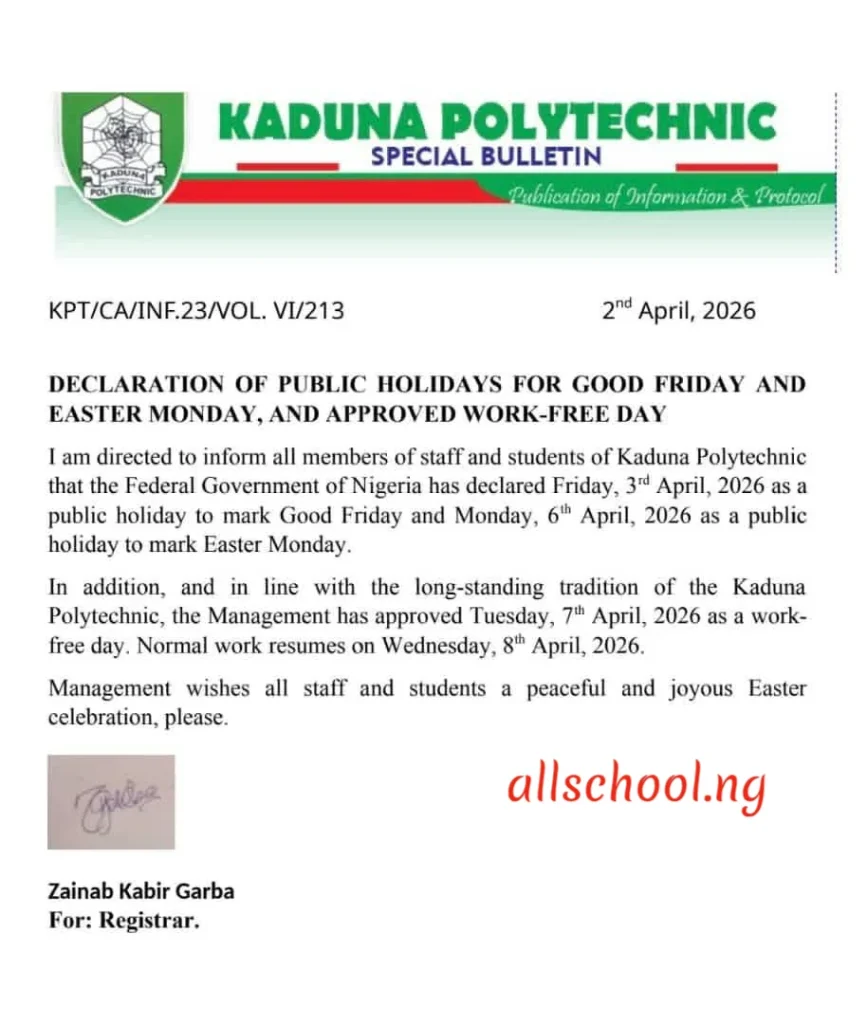 This is to inform all members of staff and students of Kaduna Polytechnic that the Federal Government of Nigeria has declared Friday, 3rd April, 2026 as a public holiday to mark Good Friday and Monday, 6th April, 2026 as a public holiday to mark Easter Monday.