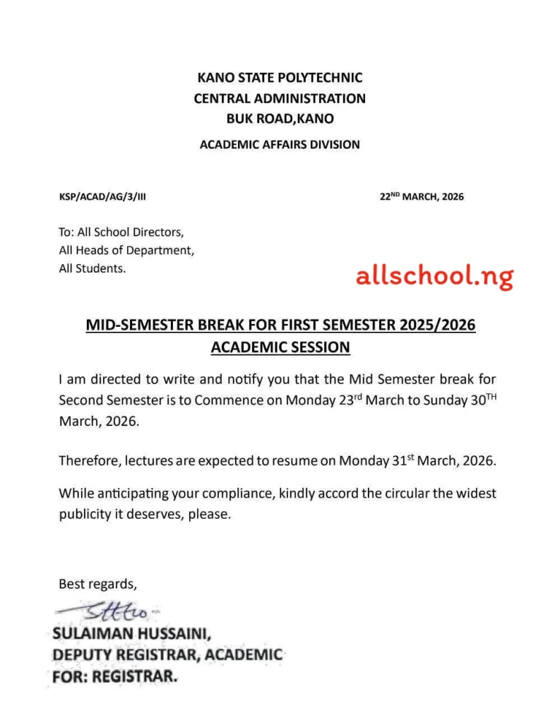 Kano State Polytechnic notice on Mid-Semester Break 2026.