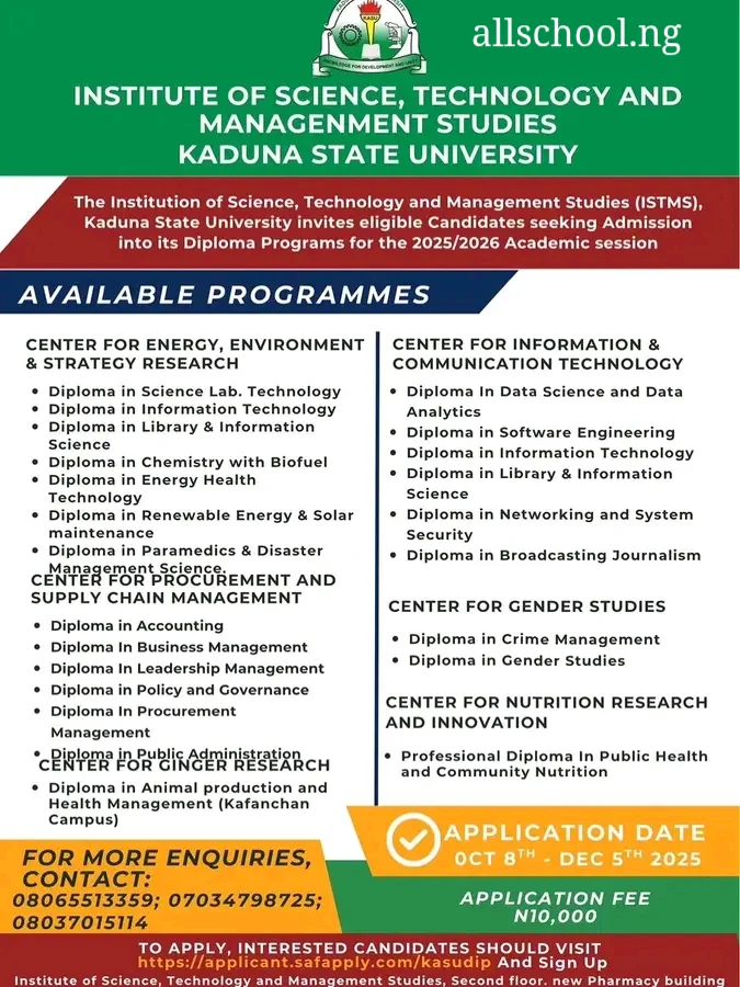 The Institute of Science, Technology and Management Studies (ISTMS), Kaduna State University invites all eligible candidates seeking admission into its Diploma, Certificate, and Advance Diploma programs for the 2025/2026 Academic Session.