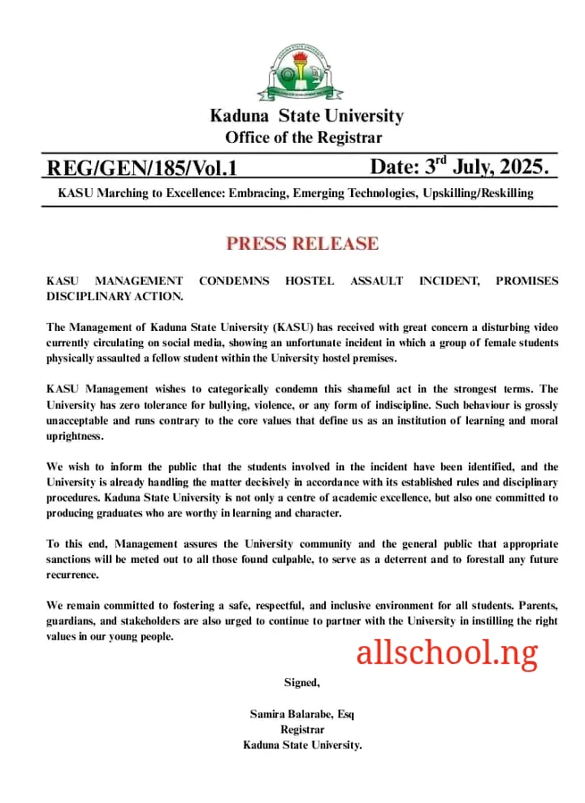 The Management of Kaduna State University (KASU) has received with great concern a disturbing video currently circulating on social media, showing an unfortunate incident in which a group of female students physically assaulted a fellow student within the University hostel premises.