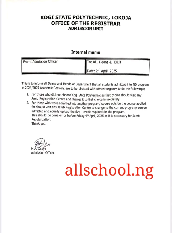 Kogi State Polytechnic Issues Urgent Directive for ND Students Admitted in 2024/2025 Session.