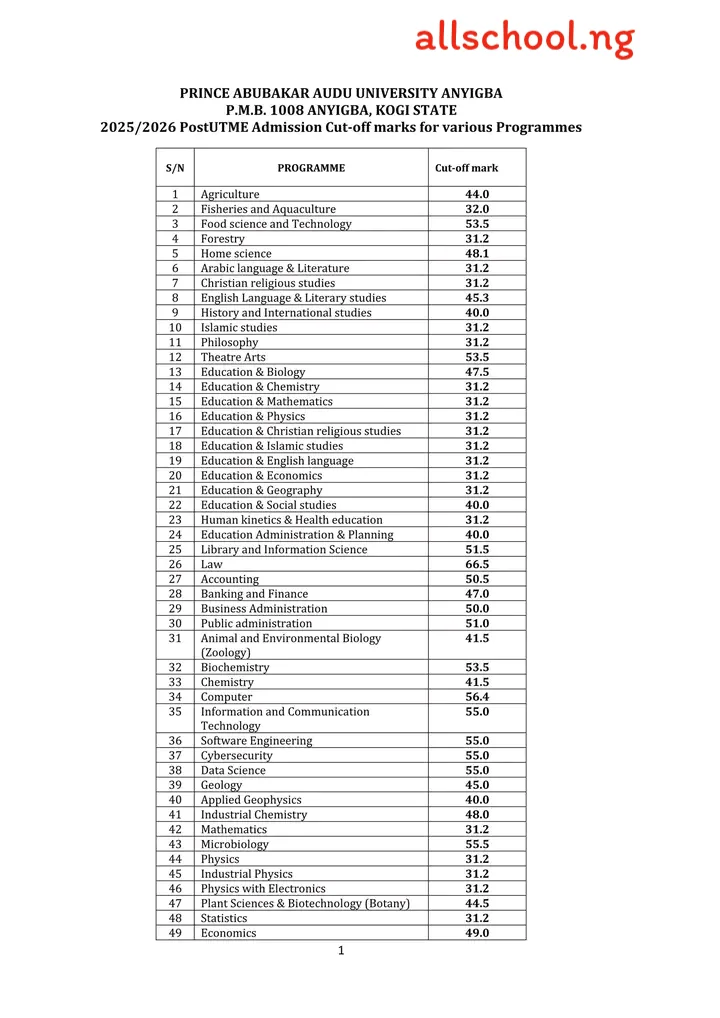 The Management of Prince Abubakar Audu University (PAAU), Anyigba, has officially released the approved Post-UTME departmental cut-off marks for the 2025/2026 admission exercise. The cut-off marks, which are determined as an aggregate of candidates’ performance in the Unified Tertiary Matriculation Examination (UTME) and their WAEC results, will serve as the benchmark for admission into the University’s various programmes.